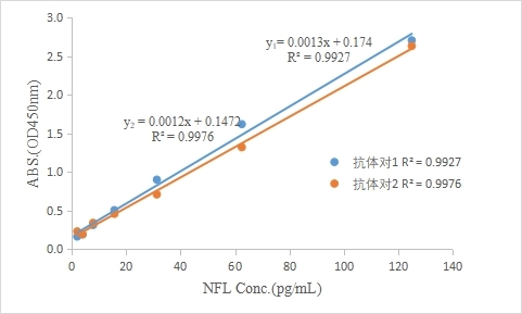1. 产品性能:采用NFL抗体对1: Capture (Cat: V5508) - Detection (Cat: V5511);抗体对2: Capture (Cat: V5508) - Detection (Cat: V5512)建立ELISA标准曲线,相关系数R2>0.99,线性范围均为1.95-125 pg/mL,灵敏度为1.95 pg/mL。