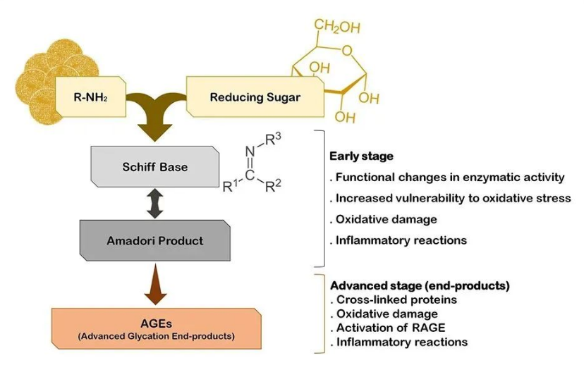 AGEs是还原糖与蛋白质、脂质或核酸之间,主要经美拉德反应(即非酶糖基化反应)形成的一组修饰分子产物。