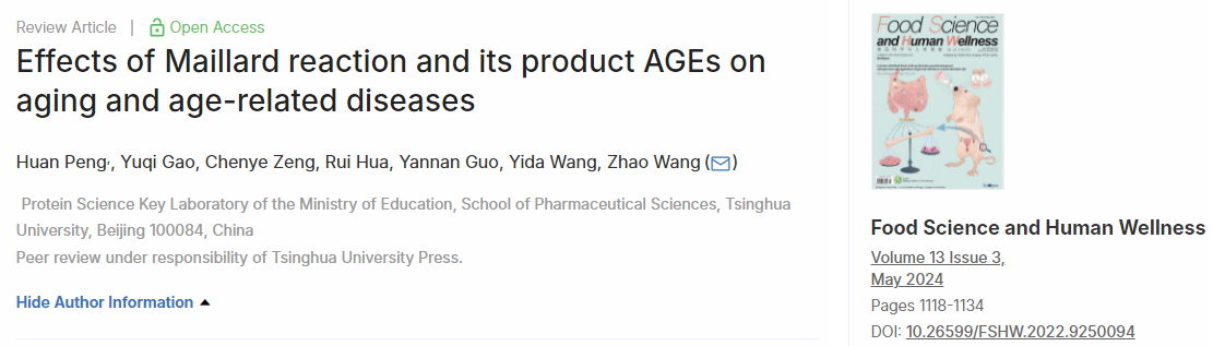 清华大学药学院王钊教授课题组在食品科技领域专业期刊Food Science and Human Wellness杂志在线发表文章“Effects of Maillard reaction and its product AGEs on aging and age-related diseases”以AGEs为主要讨论对象,希望人们重视美拉德反应与人类衰老和健康之间的潜在联系,合理控制饮食和规划生活方式。