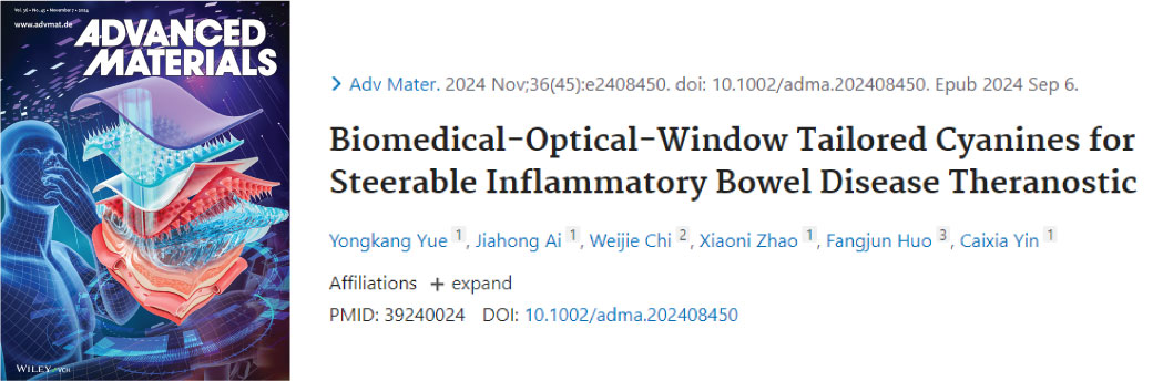 作者单位:山西大学摘要:Tailored photophysical properties and chemical activity is the ultimate pursuit of functional dyes for in vivo biomedical theranostics. In this work, the independent regulation of the absorption and fluorescence emission wavelengths of heptamethine cyanines is reported. These dyes retain near-infrared fluorescence emission (except a nitro-modified dye) while feature variable absorption wavelengths ranging from 590 to 860 nm. This enables to obtain customized functional dyes that meet the excitation and fluorescence wavelength requirements defined by the optical properties of tissues for in vivo biomedical applications. Typically, a nitro-modified photothermal active derivative Cy-Mu-7-9 is used, which features strong absorption at 810 nm in PBS, a wavelength that balanced the tissue penetration depth and non-specific photothermal effect, to realize non-destructive inflammatory bowel disease (IBD) therapy via photothermal induced up-regulation of heat shock protein 70 in the intestinal epithelial cells. The corresponding amino-modified dye Cy-Mu-7-9-NH2, which can be formed in health enteric cavity by Cy-Mu-7-9 after oral administration, is a fluorescence compound with the emission of 800 nm in PBS. Based on the IBD sensitive transformation of Cy-Mu-7-9 and Cy-Mu-7-9-NH2, in vivo IBD theranostic and therapeutic effect evaluation is realized via the synergy of fluorescence imaging and photothermal therapy for the first time.