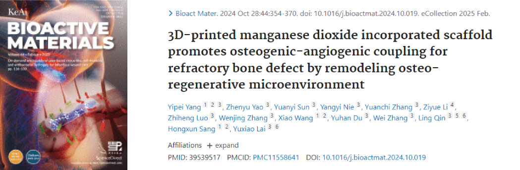 摘要:The treatment of refractory bone defects is a major clinical challenge, especially in steroid-associated osteonecrosis (SAON), which is characterized by insufficient osteogenesis and angiogenesis. Herin, a microenvironment responsiveness scaffold composed of poly-L-lactide (PLLA), and manganese dioxide (MnO2) nanoparticles is designed to enhance bone regeneration by scavenging endogenous reactive oxygen species (ROS) and modulating immune microenvironment in situ. A catalase-like catalytic reaction between MnO2 and endogenous hydrogen peroxide (H2O2) generated at the bone defect area, which typically becomes acidic and ROS-rich, triggers on-demand release of oxygen and Mn2+, significantly ameliorating inflammatory response by promoting M2-type polarization of macrophages, reprograming osteoimmune microenvironment conducive to angiogenesis and osteogenesis. Furthermore, the fundamental mechanisms were explored through transcriptome sequencing analysis, revealing that PLLA/MnO2 scaffolds (PMns) promote osteogenic differentiation by upregulating the TGF-β/Smad signaling pathway in human bone marrow mesenchymal stem cells (hBMSCs). Overall, the PMns exhibit superior immunomodulatory, excellent osteogenic-angiogenic properties and promising candidates as bone graft substitutes for therapy clinical refractory bone defects.