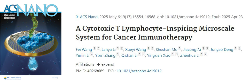 摘要:Adoptive T cell therapy (ACT) is an emerging cancer immunotherapy undergoing clinical evaluation, showing significant promise in the treatment of solid tumors. However, the clinical translation of ACT is hindered by its time-, labor-, and financial-consuming procedures, heterogeneity of cytotoxic T lymphocytes (CTLs), and immunosuppressive tumor microenvironment. Herein, we have developed a bionic cytotoxic T lymphocyte-inspiring microscale system (CTLiMS) composed of mesoporous silica dioxide microspheres containing membrane-disrupting boron clusters (BICs) and proapoptotic monomethyl auristatin E (MMAE) peptides. The BICs were found to disrupt the integrity of cancer cell membranes and enhance the internalization of MMAE, effectively mimicking the biological functions of perforin and granzymes released by CTLs to destroy cancer cells. As expected, the CTLiMSs demonstrated exceptional in vitro anticancer activity, inducing cancer cell apoptosis and exhibiting strong antiproliferative effects. Notably, CTLiMS treatment was demonstrated to induce immunogenic cell death of cancer cells as a result of Ca2+ and MMAE influx and subsequent production of reactive oxygen species. The animal studies demonstrated that the CTLiMS treatment led to efficient repression of the tumor growth. Furthermore, the CTLiMS administration resulted in favorable antitumor immunotherapeutic effects, as shown by significant inhibition of distant tumors, increased immune cell infiltration, and elevated plasma levels of pro-inflammatory cytokines. This pilot study using CTLiMSs for cancer immunotherapy offers an innovative bionic strategy for the future advancement of adoptive T cell therapy.