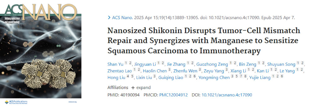 摘要:Head and neck squamous cell carcinoma (HNSCC) frequently develops resistance to immune checkpoint blockade (ICB) therapy, resulting from an immune-excluded microenvironment. Immunogenic cell death (ICD) can increase tumor immunogenicity and further augment immune-cell infiltration by releasing immunogenic molecules. Hence, inducing ICD within tumors might be a promising strategy to restore antitumor immunity and sensitize HNSCC to ICB. Herein, we developed shikonin (SHK)-loaded, CGKRK-modified lipid nanoparticles (C-SNPs) and demonstrated that C-SNPs could enrich in tumor cells and induce necroptosis in vitro and in vivo. Transcriptomic profiling revealed that C-SNPs suppressed tumor-cell mismatch repair, which later activated the cGAS-mediated IFN response and further increased the expression of PD-L1. Combining C-SNPs with an anti-PD-1 antibody increased the infiltration of DCs and CD8+ T cells, yet the response was limited. Modifying C-SNPs with Mn2+ (C-SMNPs) enhanced the activation of cGAS-STING signaling and further boosted the maturation of DCs and the differentiation of cytotoxic T cells within ICB-treated tumors. Importantly, compared to C-SNPs, the combination of C-SMNPs with ICB resulted in more sustained tumor suppression in vivo. Together, we developed a versatile nanoparticle that delivered SHK and Mn2+ which sensitized HNSCC to ICB by disrupting tumor-cell mismatch repair and boosting the cGAS-STING-mediated IFN response. This nanosized ICD inducer-based strategy holds therapeutic potential in synergizing with anti-PD-1 immunotherapy to enhance treatment efficacy in HNSCC.