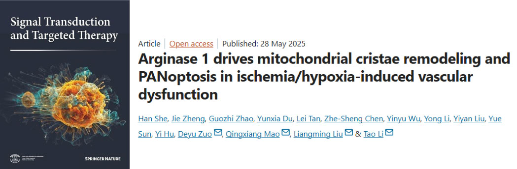 摘要:Ischemic/hypoxic injury significantly damages vascular function, detrimentally impacting patient outcomes. Changes in mitochondrial structure and function are closely associated with ischemia/hypoxia-induced vascular dysfunction. The mechanism of this process remains elusive. Using rat models of ischemia and hypoxic vascular smooth muscle cells (VSMCs), we combined transmission electron microscopy, super-resolution microscopy, and metabolic analysis to analyze the structure and function change of mitochondrial cristae. Multi-omics approaches revealed arginase 1 (Arg1) upregulation in ischemic VSMCs, confirmed by in vivo and in vitro knockout models showing Arg1’s protective effects on mitochondrial cristae, mitochondrial and vascular function, and limited the release of mtDNA. Mechanistically, Arg1 interacting with Mic10 led to mitochondrial cristae remodeling, together with hypoxia-induced VDAC1 lactylation resulting in the opening of MPTP and release of mtDNA of VSMCs. The released mtDNA led to PANoptosis of VSMCs via activation of the cGAS-STING pathway. ChIP-qPCR results demonstrated that lactate-mediated Arg1 up-regulation was due to H3K18la upregulation. VSMCs targeted nano-material PLGA-PEI-siRNA@PM-α-SMA (NP-siArg1) significantly improved vascular dysfunction. This study uncovers a new mechanism of vascular dysfunction following ischemic/hypoxic injury: a damaging positive feedback loop mediated by lactate-regulated Arg1 expression between the nucleus and mitochondria, leading to mitochondria cristae disorder and mtDNA release, culminating in VSMCs PANoptosis. Targeting VSMCs Arg1 inhibition offers a potential therapeutic strategy to alleviate ischemia/hypoxia-induced vascular impairments.