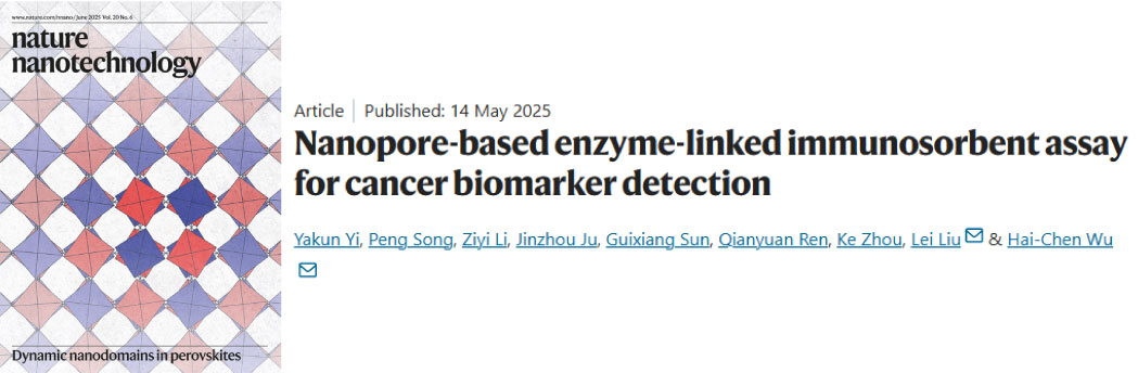 摘要:Enzyme-linked immunosorbent assay (ELISA) has been widely used in cancer diagnostics due to its specificity, sensitivity and high throughput. However, conventional ELISA is semiquantitative and has an insufficiently low detection limit for applications requiring ultrahigh sensitivity. In this study, we developed an α-hemolysin-nanopore-based ELISA for detecting cancer biomarkers. After forming the immuno-sandwich complex, peptide probes carrying enzymatic cleavage sites are introduced, where they interact with enzymes conjugated to the detection antibodies within the complex. These probes generate distinct current signatures when translocated through the nanopore after enzymatic cleavage, enabling precise biomarker quantification. This approach offers a low detection limit of up to 0.03 fg ml–1 and the simultaneous detection of six biomarkers, including antigen and antibody biomarkers in blood samples. Overall, the nanopore-based ELISA demonstrates high sensitivity and multiplexing capability, making it suitable for next-generation diagnostic and point-of-care testing applications.