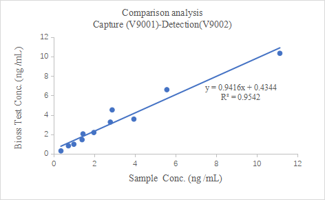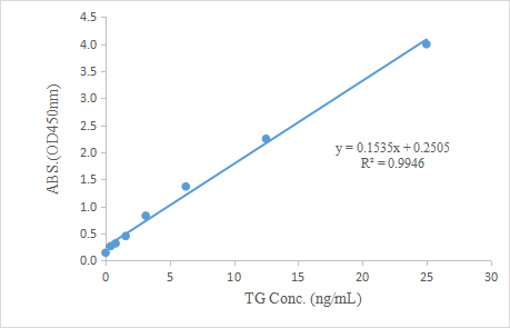 1. 产品性能:采用TG 抗体对: Capture (Cat: V9001 ) - Detection (Cat: V9002);建立ELISA标准曲线,相关系数R2>0.99,线性范围均为0.39-25 ng/mL,灵敏度为0.2ng/mL。