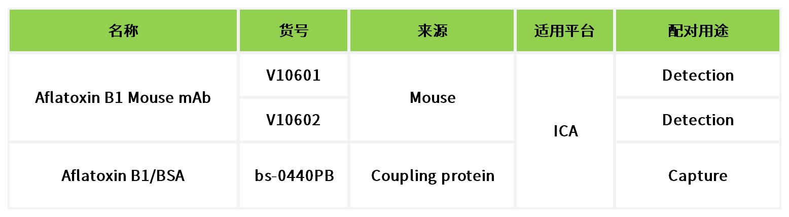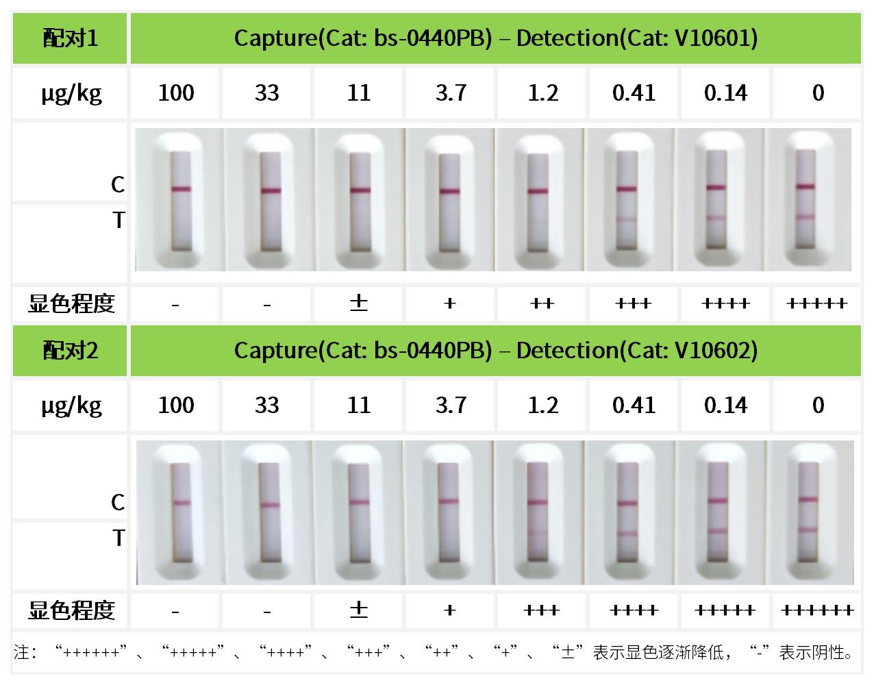 采用竞争法检测AFB1标准品:Capture(Cat: bs-0440PB) – Detection(Cat: V10601)和Capture(Cat: bs-0440PB) – Detection(Cat: V10602),在胶体金平台上检测标准品,浓度分别为100、33、11、3.7、1.2、0.41、0.14、0 μg/kg,标准品浓度为0.41 μg/kg时显色抑制>50%,结果如下: