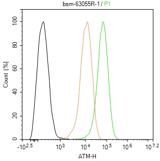 The NCCIT (H) cells were fixed with 4% PFA (10 min at r.t.) and then permeabilized with 90% ice-cold methanol for 20 min at -20℃,the cells then were incubated in 5%BSA to block non-specific protein-protein interactions (30 min at r.t.), followed by secondary antibody incubation for 40 min at room temperature. Primary Antibody (green):Rabbit Anti-ATM antibody (bsm-63055R,1:100); Isotype Control (orange): Rabbit IgG (bs-0295P). Blank control (black): PBS. Acquisition of 20,000 events was performed.