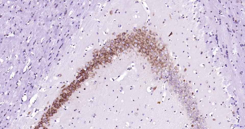 Paraformaldehyde-fixed, paraffin embedded Mouse Cerebrum; Antigen retrieval by boiling in sodium citrate buffer (pH6.0) for 15 min; Antibody incubation with Nrf2 Monoclonal Antibody, Unconjugated(bsm-61093R) at 1:200 overnight at 4°C, followed by conjugation to the SP Kit (Rabbit, SP-0023) and DAB (C-0010) staining.