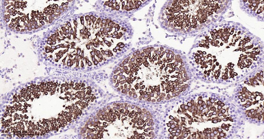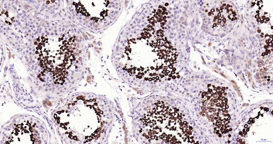 Paraformaldehyde-fixed, paraffin embedded Rat Testicles; Antigen retrieval by boiling in sodium citrate buffer (pH6.0) for 15 min; Antibody incubation with Nrf2 Monoclonal Antibody, Unconjugated(bsm-61093R) at 1:200 overnight at 4°C, followed by conjugation to the bs-0295G-HRP and DAB (C-0010) staining.