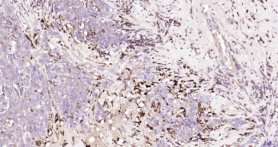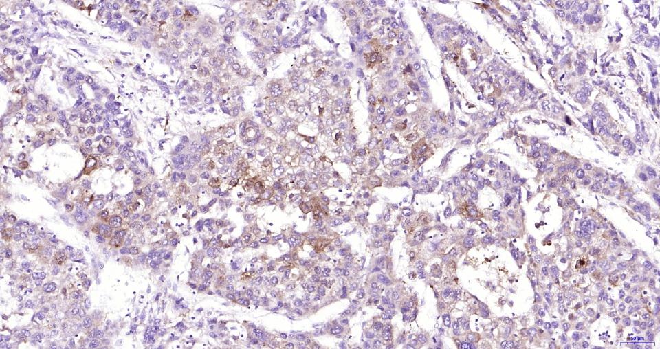 Paraformaldehyde-fixed, paraffin embedded Human Breast Cancer; Antigen retrieval by boiling in sodium citrate buffer (pH6.0) for 15 min; Antibody incubation with Nrf2 Monoclonal Antibody, Unconjugated(bsm-61093R) at 1:200 overnight at 4°C, followed by conjugation to the SP Kit (Rabbit, SP-0023) and DAB (C-0010) staining.