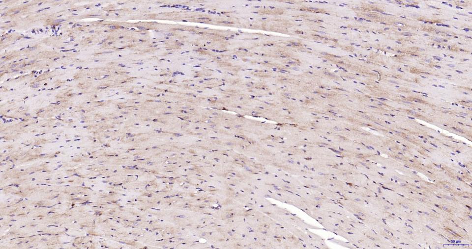 Paraformaldehyde-fixed, paraffin embedded Mouse Heart; Antigen retrieval by boiling in sodium citrate buffer (pH6.0) for 15 min; Antibody incubation with Nrf2 Monoclonal Antibody, Unconjugated(bsm-61093R) at 1:200 overnight at 4°C, followed by conjugation to the SP Kit (Rabbit, SP-0023) and DAB (C-0010) staining.