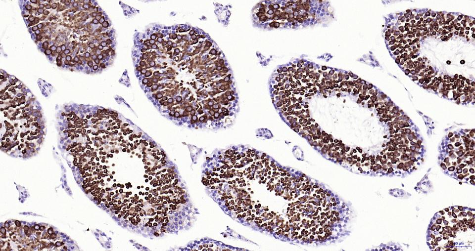 Paraformaldehyde-fixed, paraffin embedded Mouse Testicles; Antigen retrieval by boiling in sodium citrate buffer (pH6.0) for 15 min; Antibody incubation with Nrf2 Monoclonal Antibody, Unconjugated(bsm-61093R) at 1:200 overnight at 4°C, followed by conjugation to the SP Kit (Rabbit, SP-0023) and DAB (C-0010) staining.