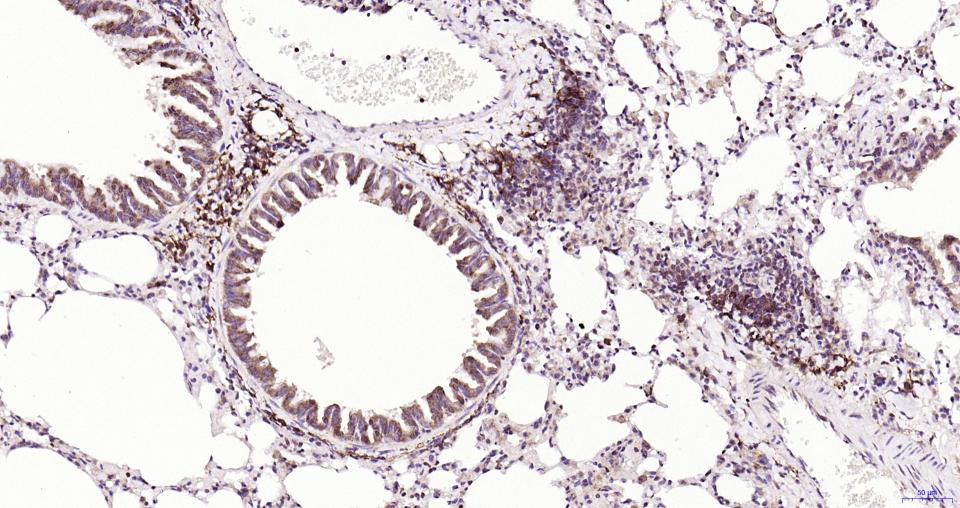 Paraformaldehyde-fixed, paraffin embedded Mouse Lung; Antigen retrieval by boiling in sodium citrate buffer (pH6.0) for 15 min; Antibody incubation with Nrf2 Monoclonal Antibody, Unconjugated(bsm-61093R) at 1:200 overnight at 4°C, followed by conjugation to the SP Kit (Rabbit, SP-0023) and DAB (C-0010) staining.