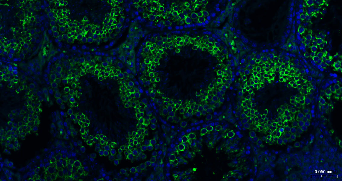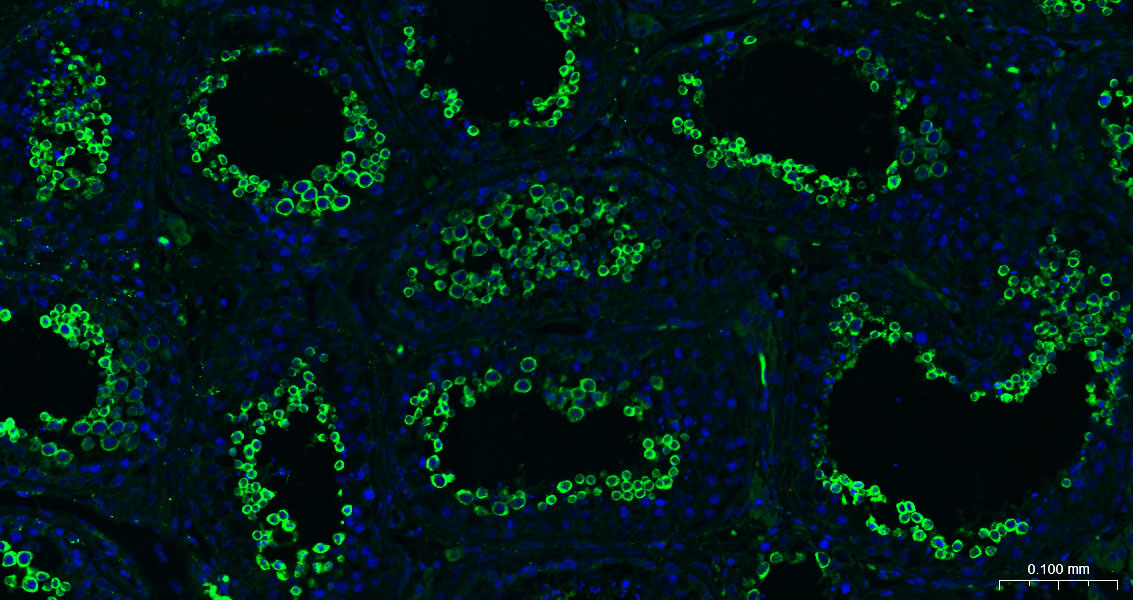 Paraformaldehyde-fixed, paraffin embedded Human Testicles; Antigen retrieval by boiling in sodium citrate buffer (pH6.0) for 15 min; The section was incubated with Nrf2 Monoclonal Antibody, Unconjugated (bsm-61093R) at 1:200 overnight at 4°C. Followed by conjugated Goat Anti-Rabbit IgG antibody (green, bs-0295G-BF488), DAPI (blue, C02-04002) was used to stain the cell nuclei.