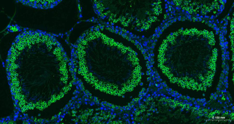 Paraformaldehyde-fixed, paraffin embedded Mouse Testicles; Antigen retrieval by boiling in sodium citrate buffer (pH6.0) for 15 min; The section was incubated with Nrf2 Monoclonal Antibody, Unconjugated (bsm-61093R) at 1:200 overnight at 4°C. Followed by conjugated Goat Anti-Rabbit IgG antibody (green, bs-0295G-BF488), DAPI (blue, C02-04002) was used to stain the cell nuclei.