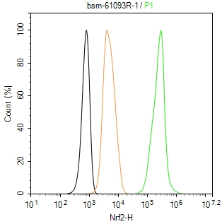 The HeLa(treated with MG-132 (10 μM,10h) ) (H) cells were fixed with 4% PFA (10 min at r.t.) and then permeabilized with 90% ice-cold methanol for 20 min at -20℃,the cells then were incubated in 5%BSA to block non-specific protein-protein interactions (30 min at r.t.).Primary Antibody (green):Rabbit Anti-Nrf2 antibody (bsm-61093R,1:100); Secondary Antibody (white blue): Goat anti-Rabbit IgG-BF488 (bs-60295G-BF488): 1 μg/test. Blank control (black): PBS. Acquisition of 20,000 events was performed.