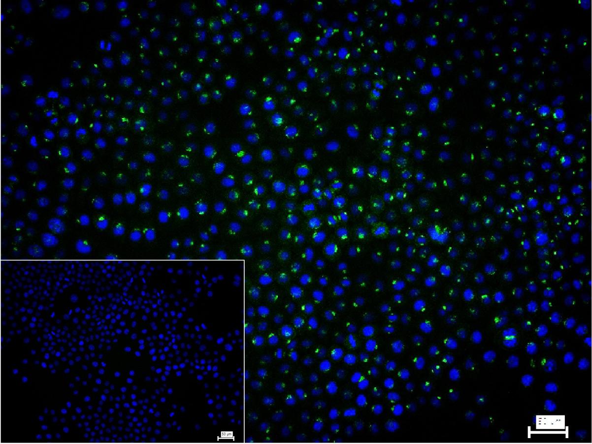 4% Paraformaldehyde-fixed Hela (H) cell; Triton X-100 at r.t. for 20 min; Antibody incubation with (Caveolin-2) monoclonal Antibody, unconjugated (bsm-61101R) 1:100, 90 min at 37°C; followed by conjugated Goat Anti-Rabbit IgG antibody (green, bs-60295G-BF488) at 37°C for 90 min, DAPI (blue, C02-04002) was used to stain the cell nuclei. PBS instead of the primary antibody was used as the blank control.