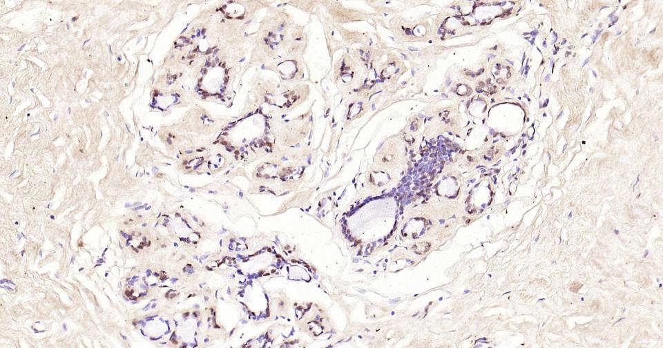 Paraformaldehyde-fixed, paraffin embedded Human Breast cancer; Antigen retrieval by boiling in sodium citrate buffer (pH6.0) for 15 min; Antibody incubation with Phospho-CREB-1 (Ser133) Monoclonal Antibody, Unconjugated(bsm-61105R) at 1:200 overnight at 4°C, followed by conjugation to the bs-0295G-HRP and DAB (C-0010) staining and DAB (C-0010) staining.