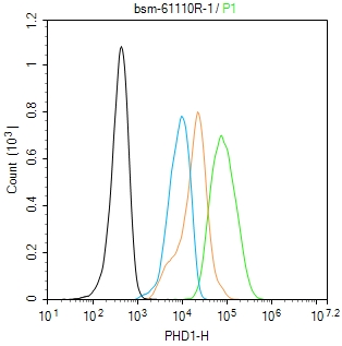 The Hela (H) cells were fixed with 4% PFA (10 min at r.t.) and then permeabilized with 90% ice-cold methanol for 20 min at -20℃,the cells then were incubated in 5%BSA to block non-specific protein-protein interactions (30 min at r.t.).Primary Antibody (green):Rabbit Anti-PHD1 antibody (bsm-61110R,1:100); Secondary Antibody (white blue): Goat anti-Rabbit IgG-BF488 (bs-60295G-BF488): 1 μg/test. Isotype Control (orange): Rabbit IgG (bs-0295P). Blank control (black): PBS. Acquisition of 20,000 events was performed.