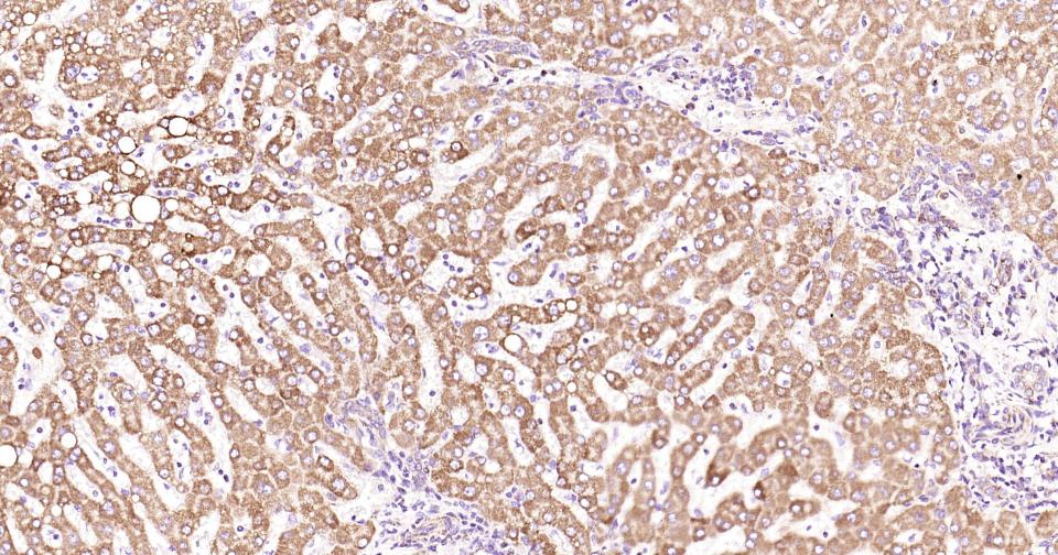 Paraformaldehyde-fixed, paraffin embedded Human Liver ; Antigen retrieval by boiling in sodium citrate buffer (pH6.0) for 15 min; Antibody incubation with Shh Monoclonal Antibody, Unconjugated(bsm-61111R) at 1:200 overnight at 4°C, followed by conjugation to the SP Kit (Rabbit, SP-0023) and DAB (C-0010) staining.