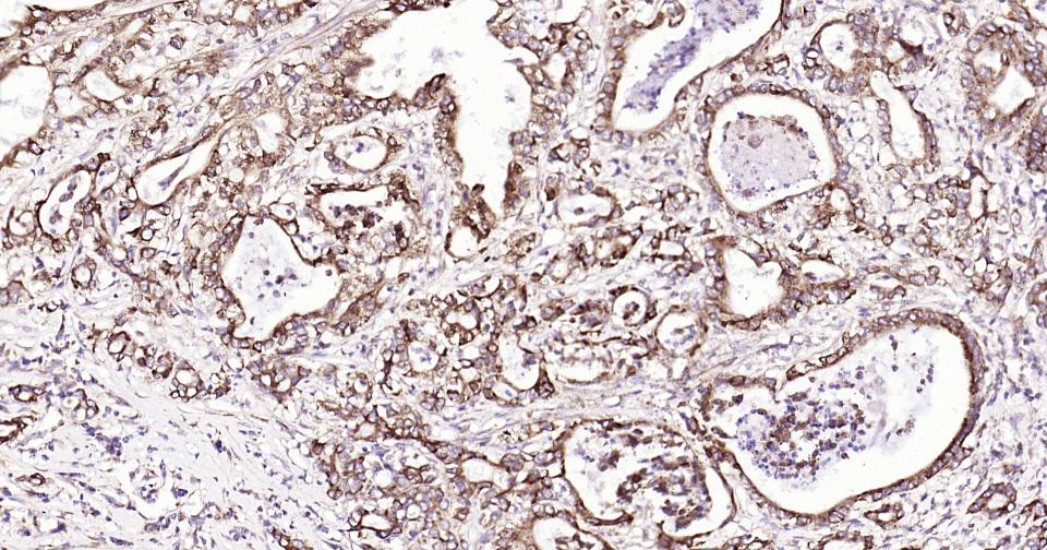 Paraformaldehyde-fixed, paraffin embedded Human Pancreatic Cancer; Antigen retrieval by boiling in sodium citrate buffer (pH6.0) for 15 min; Antibody incubation with Shh Monoclonal Antibody, Unconjugated(bsm-61111R) at 1:200 overnight at 4°C, followed by conjugation to the SP Kit (Rabbit, SP-0023) and DAB (C-0010) staining.