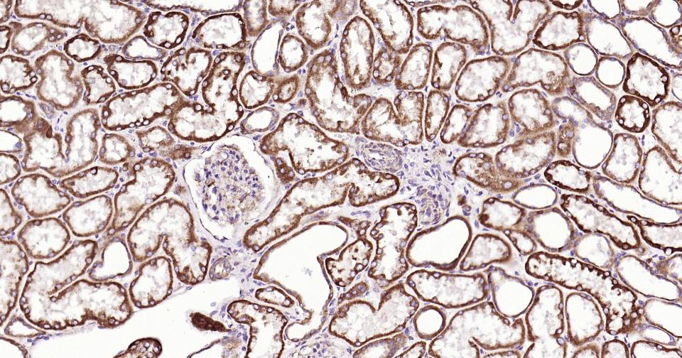 Paraformaldehyde-fixed, paraffin embedded Human Kidney; Antigen retrieval by boiling in sodium citrate buffer (pH6.0) for 15 min; Antibody incubation with Shh Monoclonal Antibody, Unconjugated(bsm-61111R) at 1:200 overnight at 4°C, followed by conjugation to the SP Kit (Rabbit, SP-0023) and DAB (C-0010) staining.