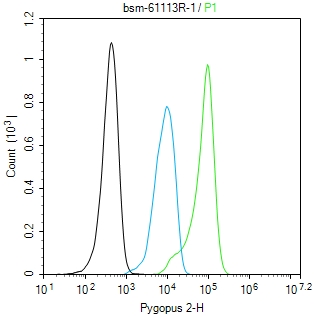 The Hela (H) cells were fixed with 4% PFA (10 min at r.t.) and then permeabilized with 90% ice-cold methanol for 20 min at -20℃,the cells then were incubated in 5%BSA to block non-specific protein-protein interactions (30 min at r.t.).Primary Antibody (green):Rabbit Anti-Pygopus 2 antibody (bsm-61113R,1:100); Secondary Antibody (white blue): Goat anti-Rabbit IgG-BF488 (bs-60295G-BF488): 1 μg/test. Blank control (black): PBS. Acquisition of 20,000 events was performed.