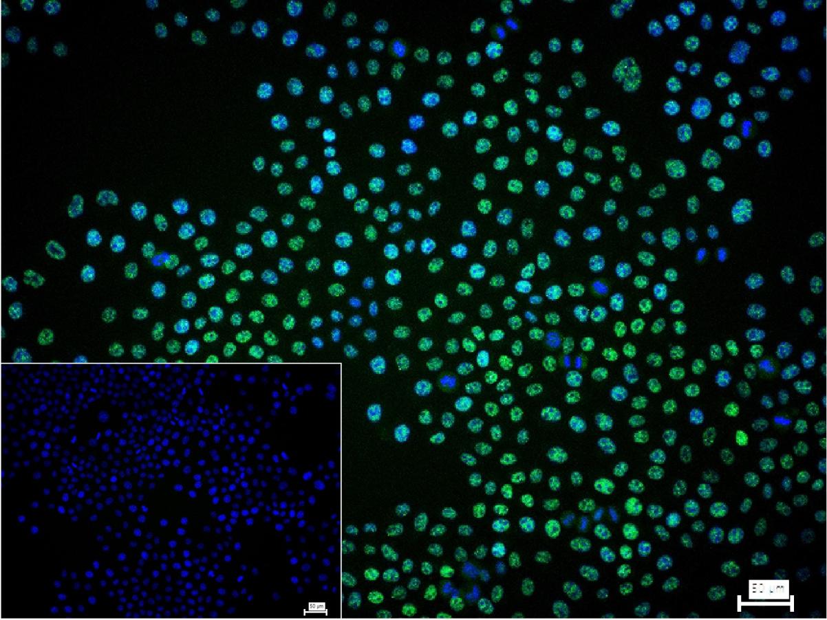 4% Paraformaldehyde-fixed Hela (H) cell; Triton X-100 at r.t. for 20 min; Antibody incubation with (Pygopus 2) monoclonal Antibody, unconjugated (bsm-61113R) 1:100, 90 min at 37°C; followed by conjugated Goat Anti-Rabbit IgG antibody (green, bs-60295G-BF488) at 37°C for 90 min, DAPI (blue, C02-04002) was used to stain the cell nuclei. PBS instead of the primary antibody was used as the blank control.