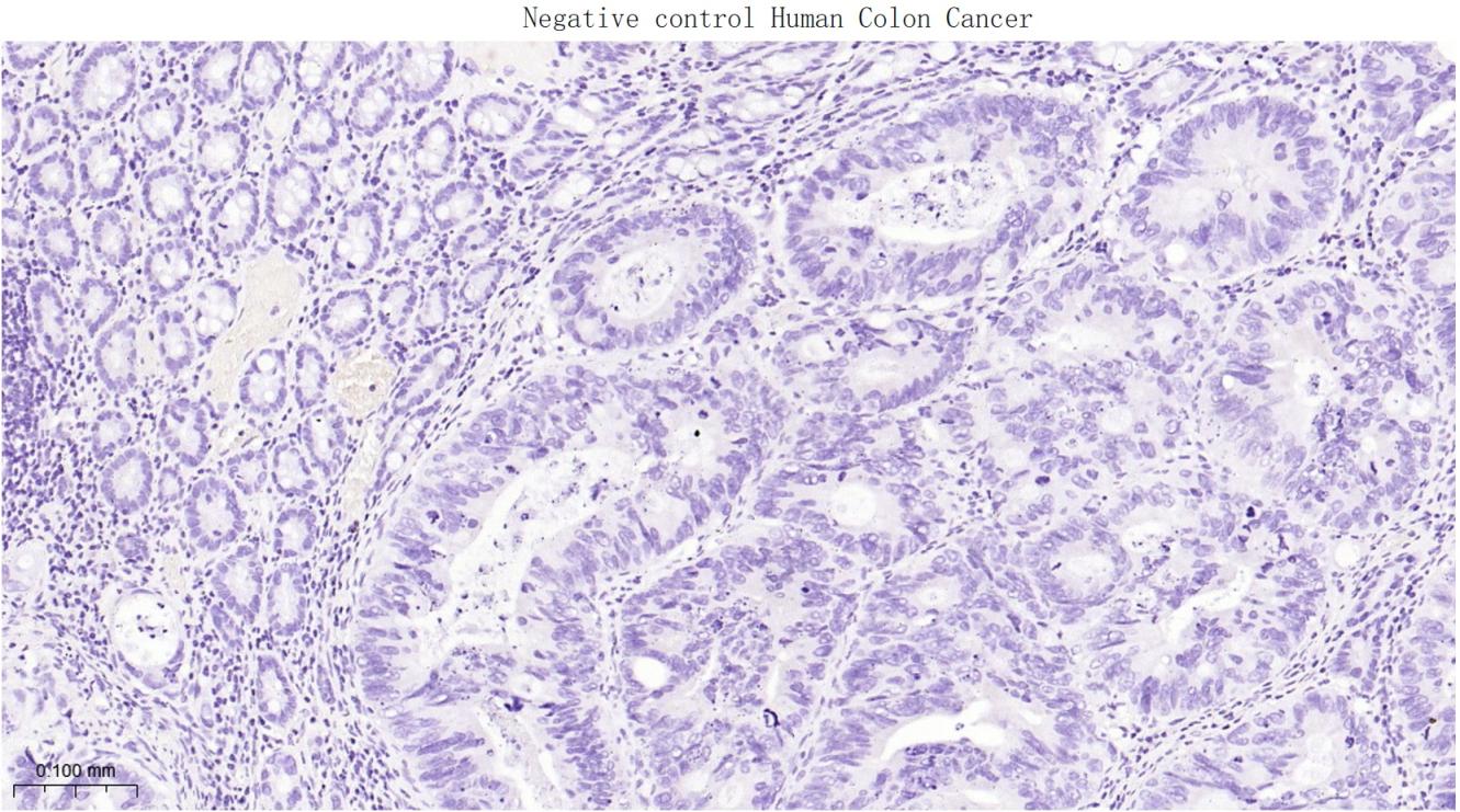 (Negative control)Paraformaldehyde-fixed, paraffin embedded Human Colon Cancer; Antigen retrieval by boiling in sodium citrate buffer (pH6.0) for 15 min; The section was incubated with OLIG2 Monoclonal Antibody, Unconjugated (bsm-61115R) at 1:200 overnight at 4°C, followed by conjugation to the bs-0295G-HRP and DAB (C-0010) staining.