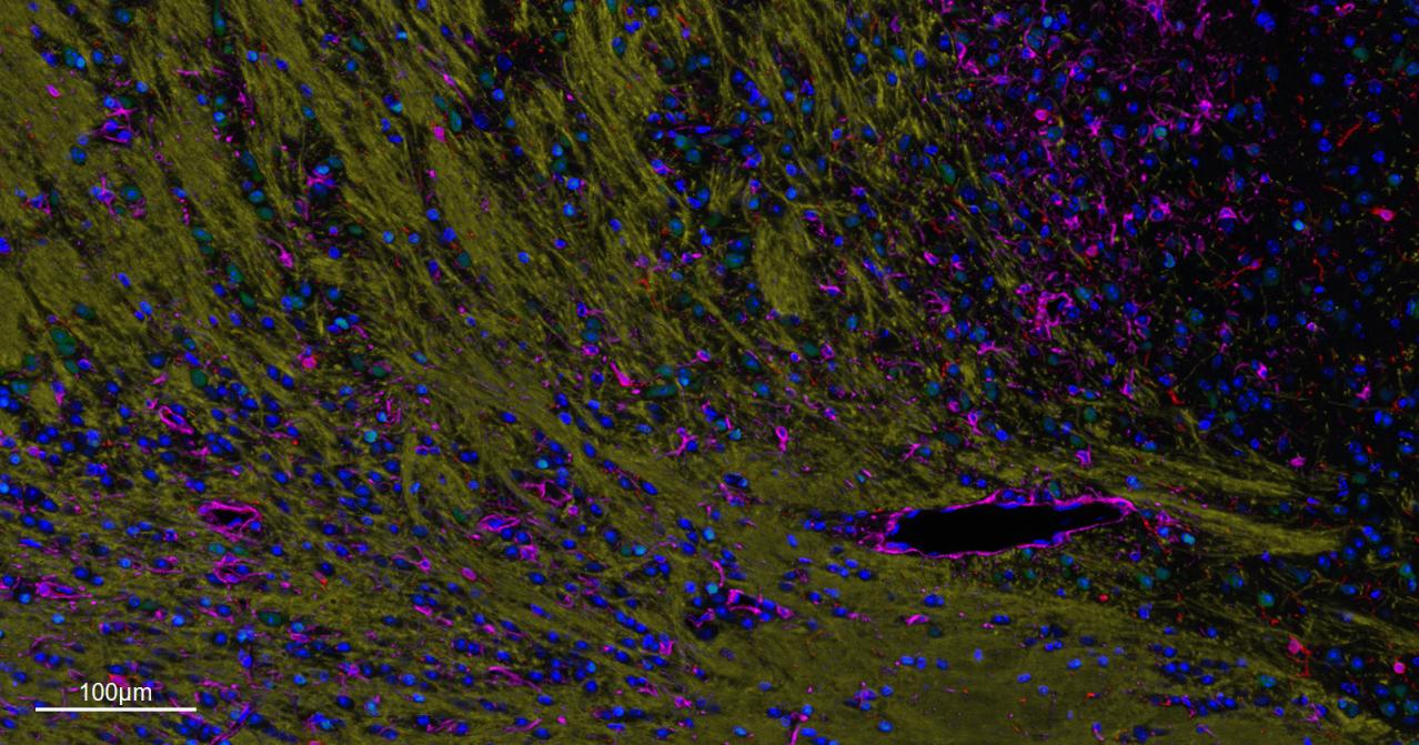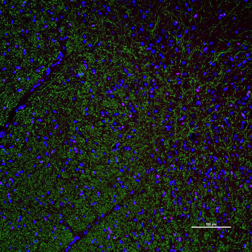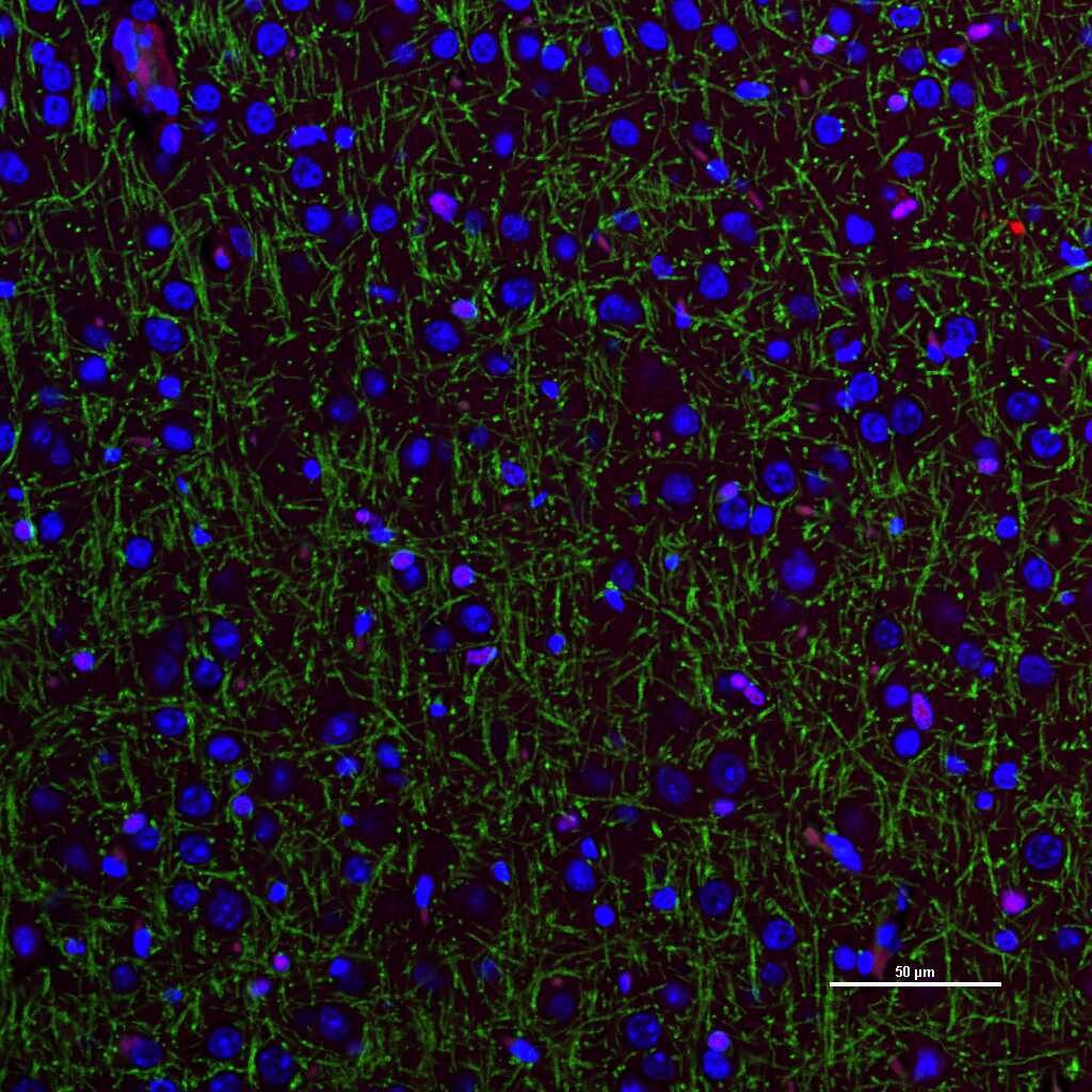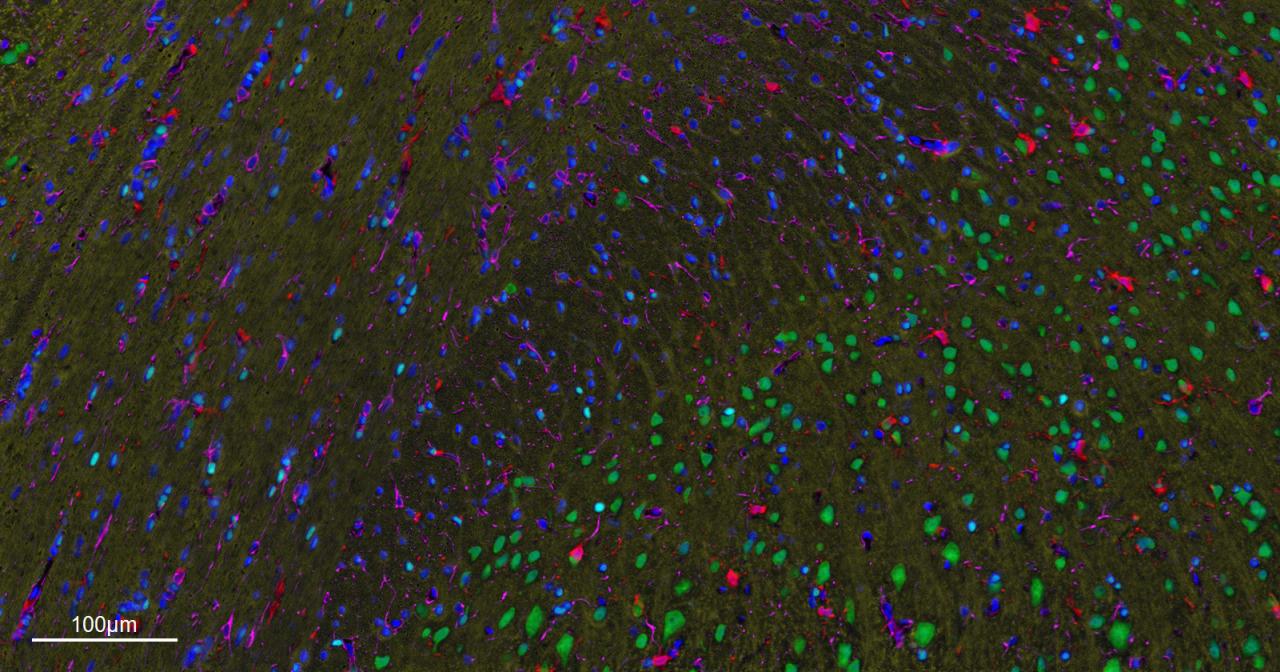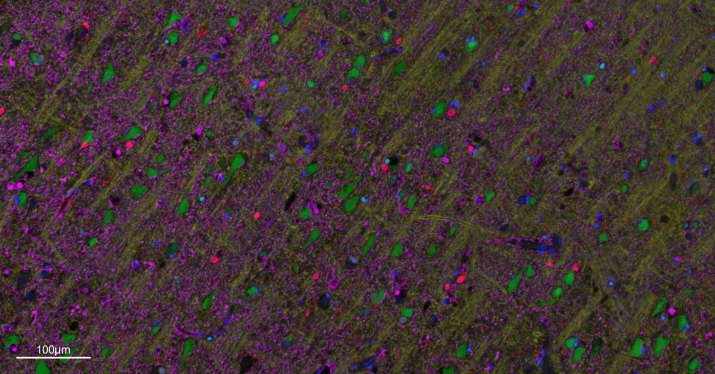 Merged staining of anti-GFAP (bsm-42001R; 1:200; pink) anti-AIF1/Iba1 (bsm-54132R; 1:200; red) anti-NeuN (bsm-52268R; 1:200; green) anti-MBP (bsm-33932M; 1:200; yellow) and anti-Olig2 (bsm-61115R; 1:200; light blue) .