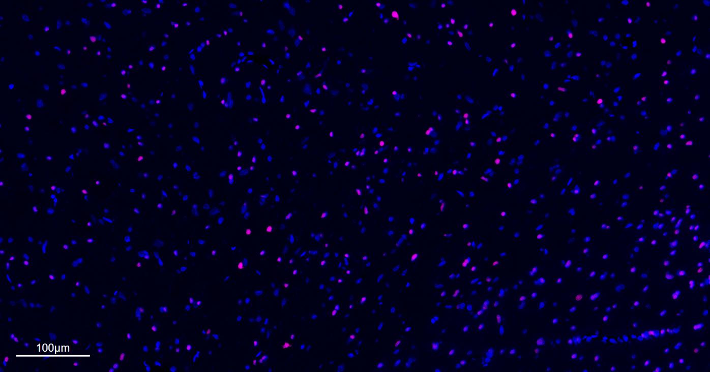 Paraformaldehyde-fixed, paraffin embedded Rat Cerebrum; Antigen retrieval by boiling in sodium citrate buffer (pH6.0) for 15 min; The section was incubated with OLIG2 Monoclonal Antibody, Unconjugated (bsm-61115R) at 1:200 overnight at 4°C. Followed by conjugated Goat Anti-Rabbit IgG antibody (Rose pink, bs-0295G-BF647), DAPI (blue, C02-04002) was used to stain the cell nuclei.