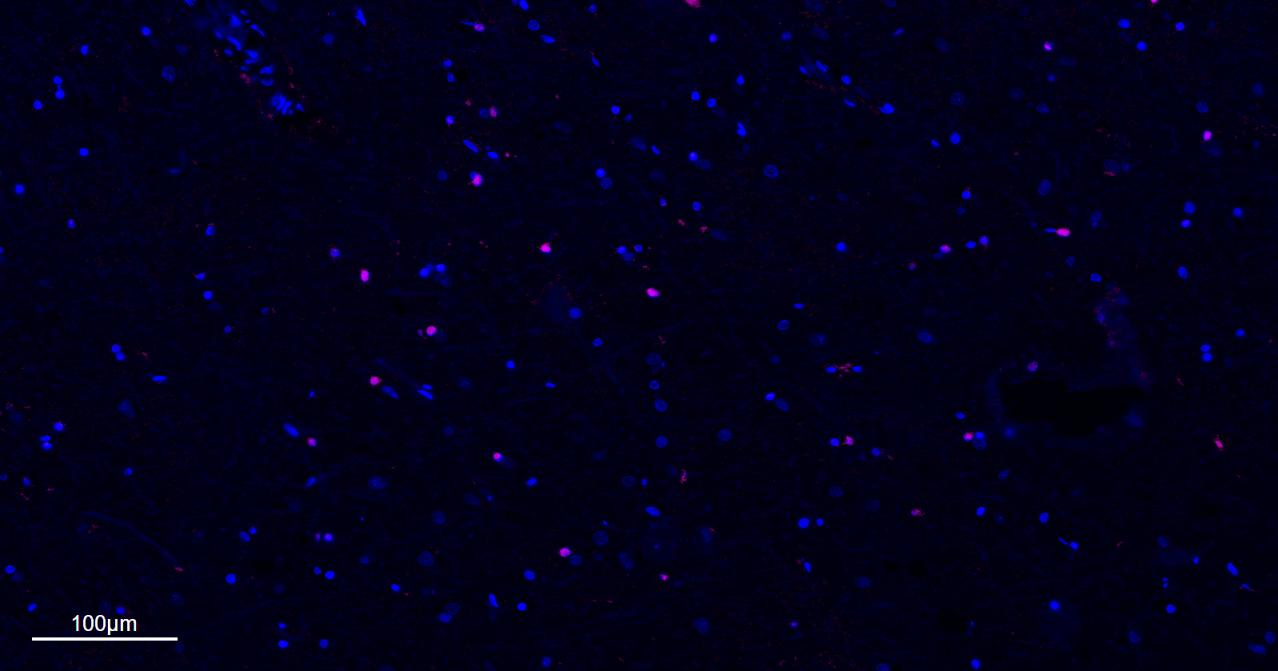 Paraformaldehyde-fixed, paraffin embedded Human Cerebrum; Antigen retrieval by boiling in sodium citrate buffer (pH6.0) for 15 min; The section was incubated with OLIG2 Monoclonal Antibody, Unconjugated (bsm-61115R) at 1:200 overnight at 4°C. Followed by conjugated Goat Anti-Rabbit IgG antibody (Rose pink, bs-0295G-BF647), DAPI (blue, C02-04002) was used to stain the cell nuclei.