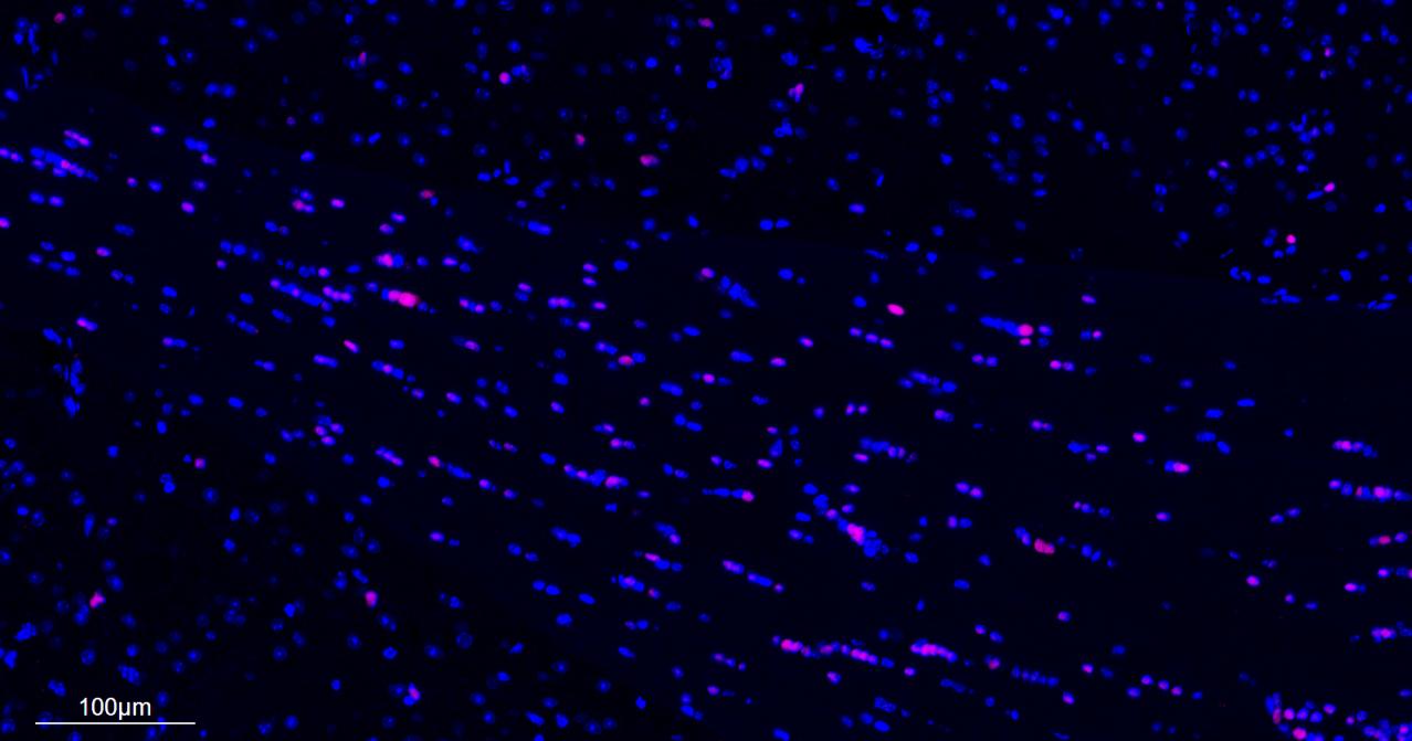 The first round ,antibody incubation with MBP Monoclonal Antibody, Unconjugated (bsm-33932M) at 1:200 overnight at 4°C. Followed by conjugated Goat Anti-Mouse IgG antibody (green, bs-0296G-BF488). The second round , antibody incubation with Olig2 Monoclonal Antibody, Unconjugated (bsm-61115R) at 1:200 overnight at 4°C. Followed by conjugated Goat Anti-Rabbit IgG antibody (red, bs-0295G-BF594). DAPI (blue, C02-04002) was used to stain the cell nuclei.