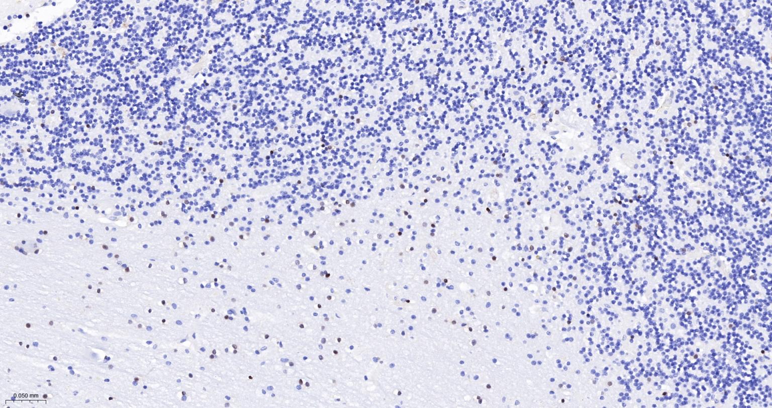Paraformaldehyde-fixed, paraffin embedded Rat Cerebellum; Antigen retrieval by boiling in sodium citrate buffer (pH6.0) for 15 min; Antibody incubation with OLIG2 Monoclonal Antibody, Unconjugated(bsm-61115R) at 1:200 overnight at 4°C, followed by conjugation to the bs-0295G-HRP and DAB (C-0010) staining.