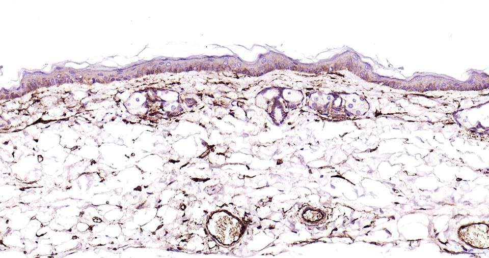 Paraformaldehyde-fixed, paraffin embedded Mouse skin; Antigen retrieval by boiling in sodium citrate buffer (pH6.0) for 15 min; Antibody incubation with Adiponectin Monoclonal Antibody, Unconjugated (bsm-61121R) at 1:200 overnight at 4°C, followed by conjugation to the bs-0295G-HRP and DAB (C-0010) staining.