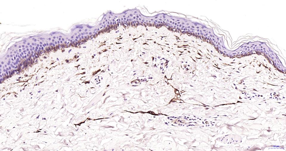 Paraformaldehyde-fixed, paraffin embedded Human skin; Antigen retrieval by boiling in sodium citrate buffer (pH6.0) for 15 min; Antibody incubation with Adiponectin Monoclonal Antibody, Unconjugated (bsm-61125R) at 1:200 overnight at 4°C, followed by conjugation to the bs-0295G-HRP and DAB (C-0010) staining.