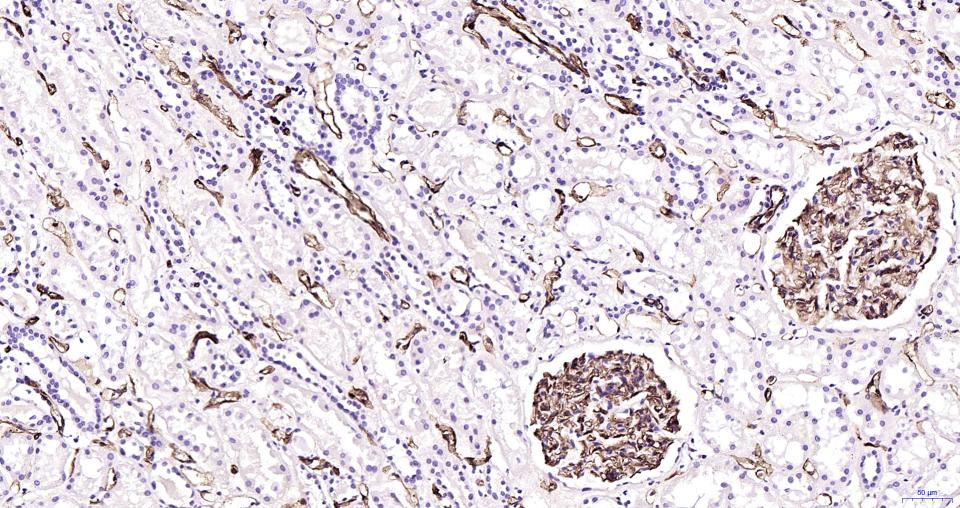 Paraformaldehyde-fixed, paraffin embedded Human kidney; Antigen retrieval by boiling in sodium citrate buffer (pH6.0) for 15 min; Antibody incubation with Adiponectin Monoclonal Antibody, Unconjugated (bsm-61125R) at 1:200 overnight at 4°C, followed by conjugation to the bs-0295G-HRP and DAB (C-0010) staining.