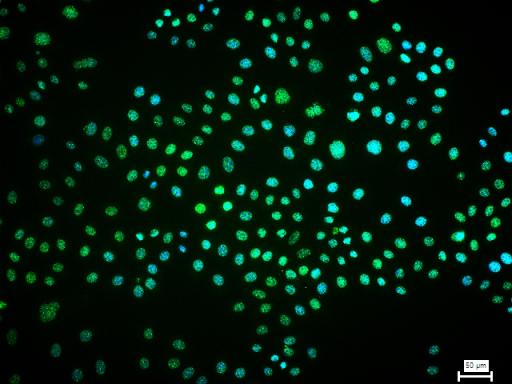 4% Paraformaldehyde-fixed HeLa(treated with MG-132 (10μM, 1hr) )(H) cell; Triton X-100 at r.t. for 20 min; Antibody incubation with (SUMO1) monoclonal Antibody, unconjugated (bsm-61144R) 1:100, 90 min at 37°C; followed by conjugated Goat Anti-Rabbit IgG antibody (green, bs-60295G-BF488) at 37°C for 90 min, DAPI (blue, C02-04002) was used to stain the cell nuclei. PBS instead of the primary antibody was used as the blank control.