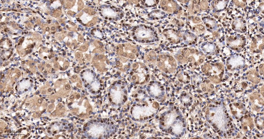 Paraformaldehyde-fixed, paraffin embedded Human Stomach; Antigen retrieval by boiling in sodium citrate buffer (pH6.0) for 15 min; The section was incubated with SUMO1 Monoclonal Antibody, Unconjugated (bsm-61144R) at 1:200 overnight at 4°C, followed by conjugation to the bs-0295G-HRP and DAB (C-0010) staining.