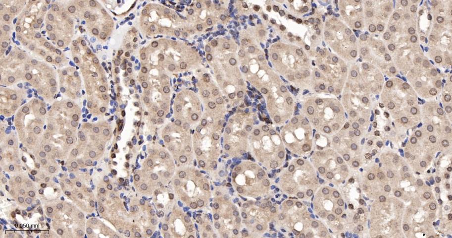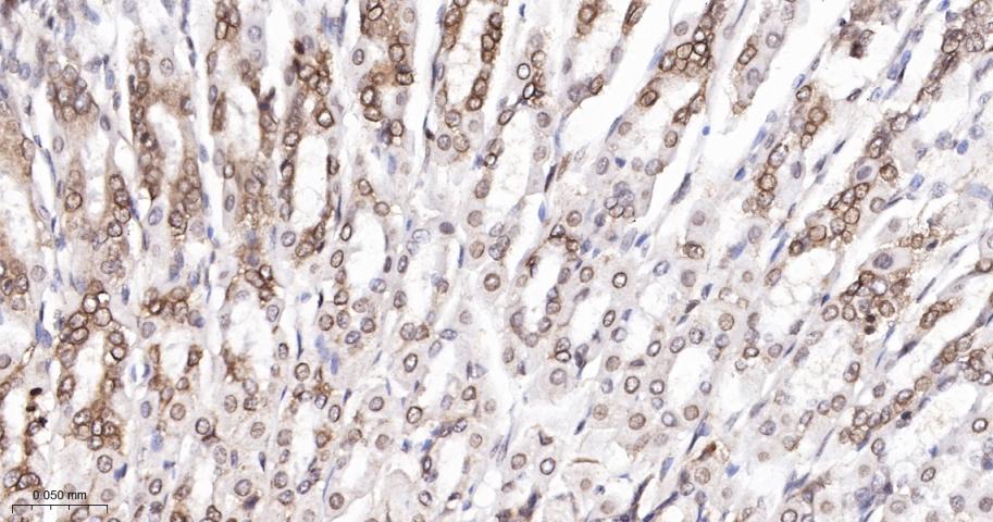 Paraformaldehyde-fixed, paraffin embedded Mouse Kidney; Antigen retrieval by boiling in sodium citrate buffer (pH6.0) for 15 min; The section was incubated with SUMO1 Monoclonal Antibody, Unconjugated (bsm-61144R) at 1:200 overnight at 4°C, followed by conjugation to the bs-0295G-HRP and DAB (C-0010) staining.