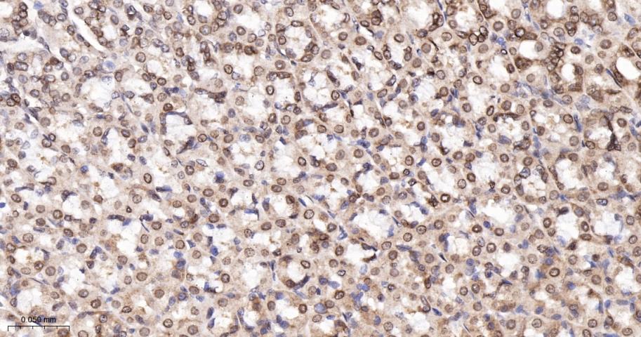 Paraformaldehyde-fixed, paraffin embedded Rat Stomach; Antigen retrieval by boiling in sodium citrate buffer (pH6.0) for 15 min; The section was incubated with SUMO1 Monoclonal Antibody, Unconjugated (bsm-61144R) at 1:200 overnight at 4°C, followed by conjugation to the bs-0295G-HRP and DAB (C-0010) staining.