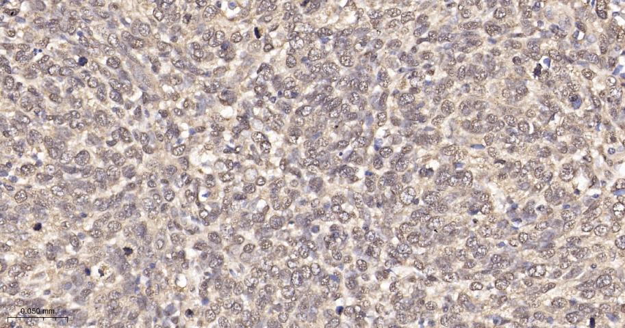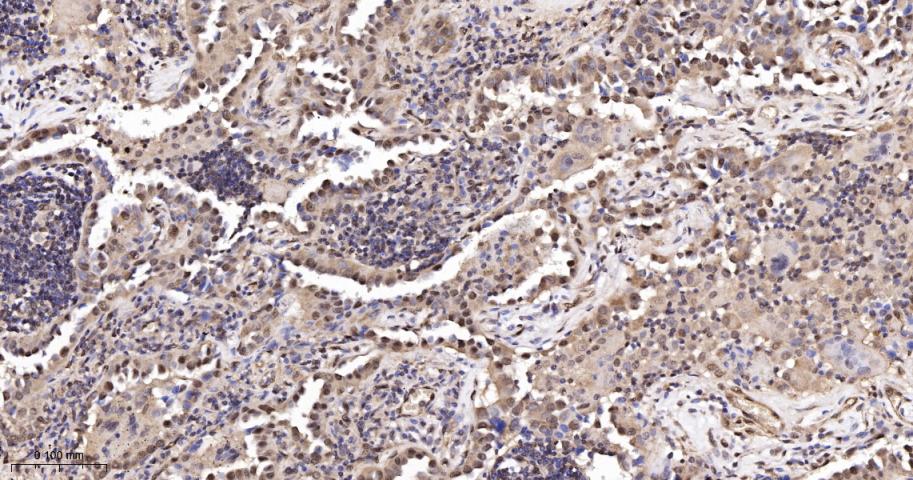Paraformaldehyde-fixed, paraffin embedded Human Lung Cancer; Antigen retrieval by boiling in sodium citrate buffer (pH6.0) for 15 min; The section was incubated with SUMO1 Monoclonal Antibody, Unconjugated (bsm-61144R) at 1:200 overnight at 4°C, followed by conjugation to the bs-0295G-HRP and DAB (C-0010) staining.