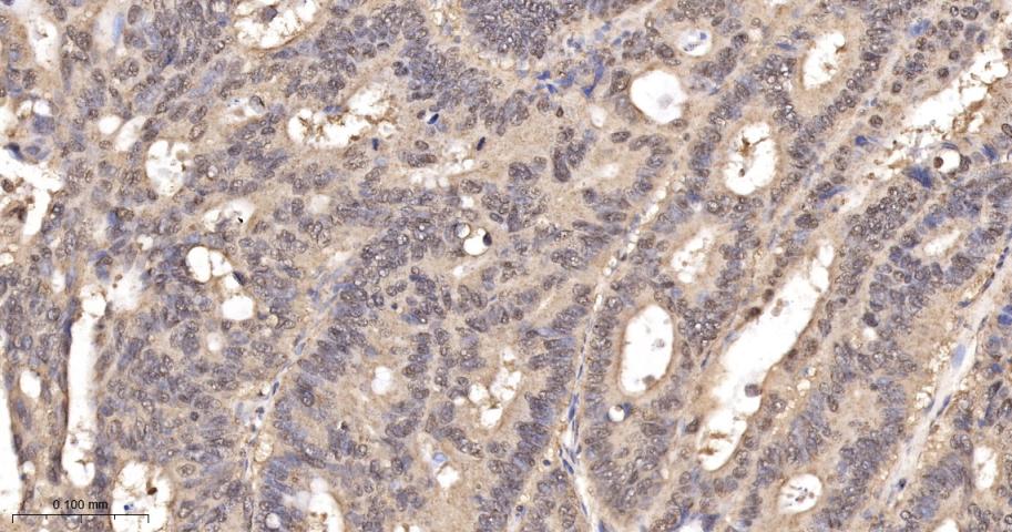 Paraformaldehyde-fixed, paraffin embedded Human Colon Cancer; Antigen retrieval by boiling in sodium citrate buffer (pH6.0) for 15 min; The section was incubated with SUMO1 Monoclonal Antibody, Unconjugated (bsm-61144R) at 1:200 overnight at 4°C, followed by conjugation to the bs-0295G-HRP and DAB (C-0010) staining.