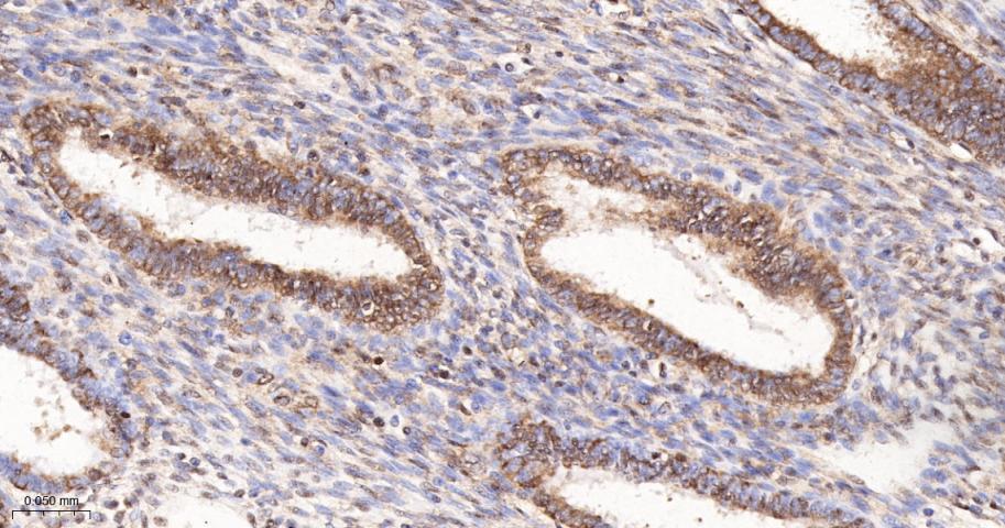Paraformaldehyde-fixed, paraffin embedded Human Endometrial; Antigen retrieval by boiling in sodium citrate buffer (pH6.0) for 15 min; The section was incubated with SUMO1 Monoclonal Antibody, Unconjugated (bsm-61144R) at 1:200 overnight at 4°C, followed by conjugation to the bs-0295G-HRP and DAB (C-0010) staining.