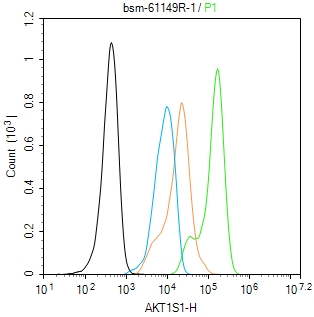 The Hela (H) cells were fixed with 4% PFA (10 min at r.t.) and then permeabilized with 90% ice-cold methanol for 20 min at -20℃,the cells then were incubated in 5%BSA to block non-specific protein-protein interactions (30 min at r.t.).Primary Antibody (green):Rabbit Anti-AKT1S1 antibody (bsm-61149R,1:100); Secondary Antibody (white blue): Goat anti-Rabbit IgG-BF488 (bs-60295G-BF488): 1 μg/test. Isotype Control (orange): Rabbit IgG (bs-0295P). Blank control (black): PBS. Acquisition of 20,000 events was performed.