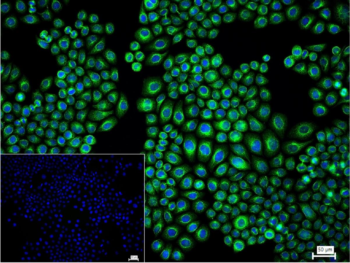 4% Paraformaldehyde-fixed Hela (H) cell; Triton X-100 at r.t. for 20 min; Antibody incubation with (AKT1S1) monoclonal Antibody, unconjugated (bsm-61149R) 1:100, 90 min at 37°C; followed by conjugated Goat Anti-Rabbit IgG antibody (green, bs-60295G-BF488) at 37°C for 90 min, DAPI (blue, C02-04002) was used to stain the cell nuclei. PBS instead of the primary antibody was used as the blank control.