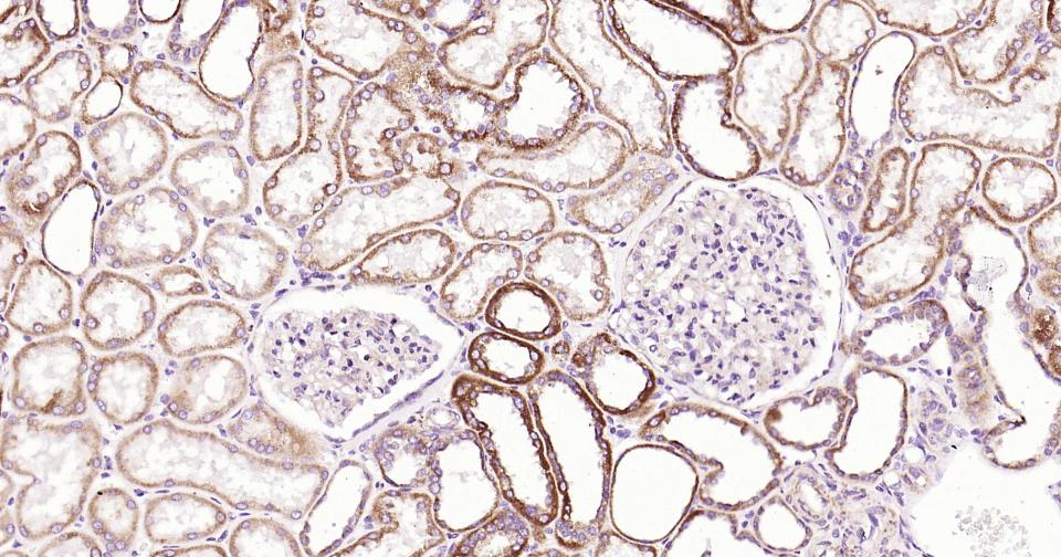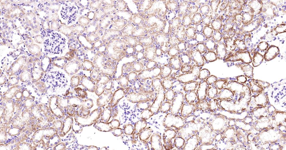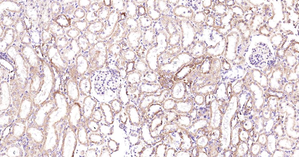 Paraformaldehyde-fixed, paraffin embedded Mouse Kidney; Antigen retrieval by boiling in sodium citrate buffer (pH6.0) for 15 min; Antibody incubation with PIK3C3 Monoclonal Antibody, Unconjugated(bsm-61161R) at 1:200 overnight at 4°C, followed by conjugation to the SP Kit (Rabbit, SP-0023) and DAB (C-0010) staining.