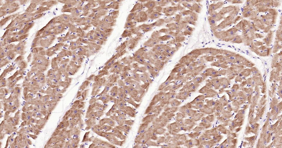 Paraformaldehyde-fixed, paraffin embedded Human Heart; Antigen retrieval by boiling in sodium citrate buffer (pH6.0) for 15 min; Antibody incubation with PIK3C3 Monoclonal Antibody, Unconjugated(bsm-61161R) at 1:200 overnight at 4°C, followed by conjugation to the SP Kit (Rabbit, SP-0023) and DAB (C-0010) staining.