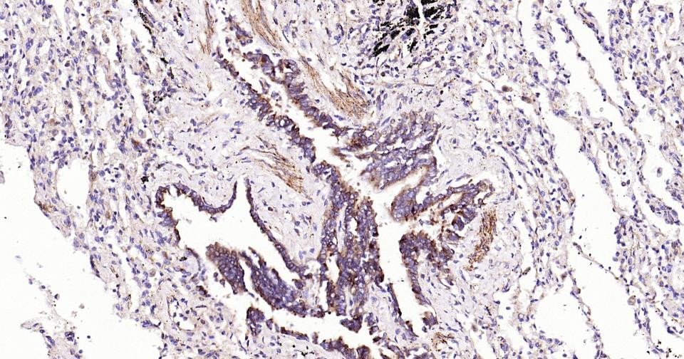 Paraformaldehyde-fixed, paraffin embedded Human Lung; Antigen retrieval by boiling in sodium citrate buffer (pH6.0) for 15 min; Antibody incubation with PIK3C3 Monoclonal Antibody, Unconjugated(bsm-61161R) at 1:200 overnight at 4°C, followed by conjugation to the SP Kit (Rabbit, SP-0023) and DAB (C-0010) staining.